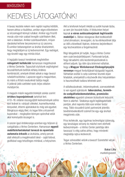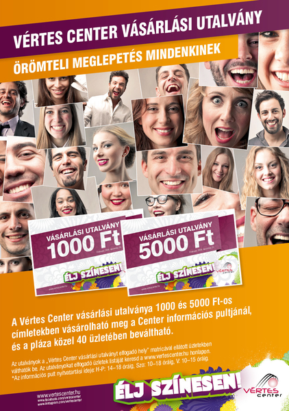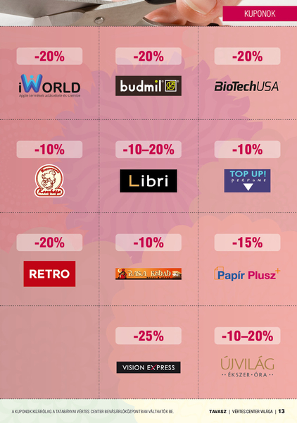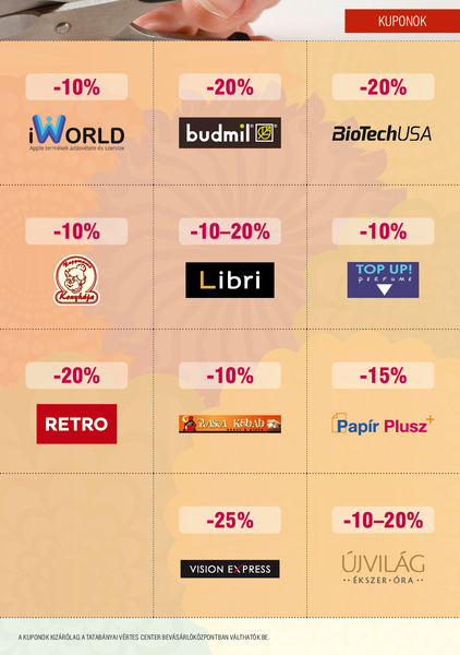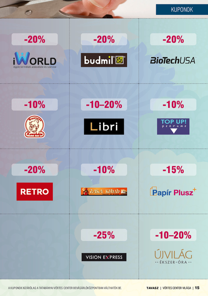 A magazin középső oldalain kivágható akciós kuponokat találsz, melyeket minden hónap adott szerdai napján tudsz beváltani a Vértes Center üzleteiben....