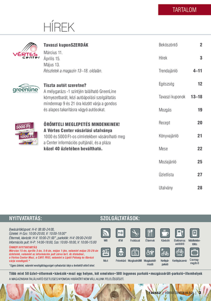 A Vértes Center három havonta, 30.000 példányban megjelenő színes magazinjában a vásárláshoz, a divathoz, szórakozáshoz, egészséges életmódhoz kapcsolódó cikkeket is olvashatsz.