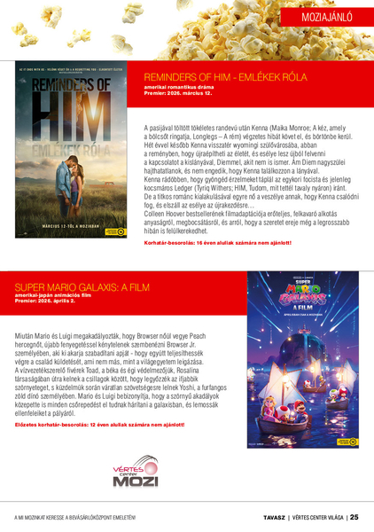 Moziajánlónk betekintést nyújt a legújabb, a Vértes Center moziban vetítésre kerülő premierjeibe, könyvajánlónk izgalmas, a Libri könyváruházban kapható könyveibe ad betekintést.