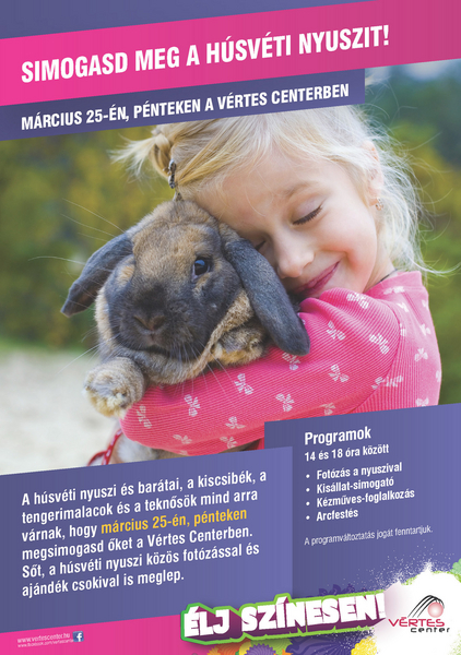 A húsvéti nyuszi és barátai, a kiscsibék, a tengerimalacok és a teknősök mind arra várnak, hogy március 25-én, pénteken megsimogasd őket a Vértes Centerben.