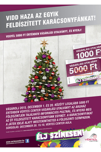 Vásárolj 2015. december 1. és 20. között legalább 5000 Ft értékben Vértes Center vásárlási utalványt az áruház földszintjén található információs pultnál és nyerd meg az 5 feldíszített karácsonyfánk egyikét.